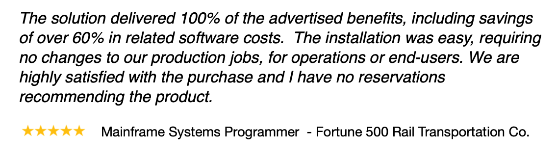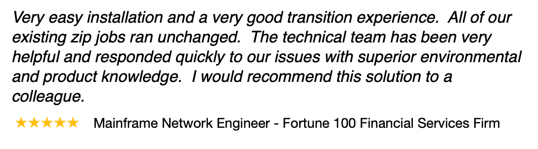 “For z/OS mainframes, Connect/ZIP (fka ZIP/390) leads third-party ZIP compression solutions with its exceptional price-performance ratio, up to 95% compression, zEDC/zIIP optimization, and robust security. Combined with JCL and API compatibility, it’s the ideal replacement for PKZIP for z/OS—reducing costs without sacrificing performance or functionality.”